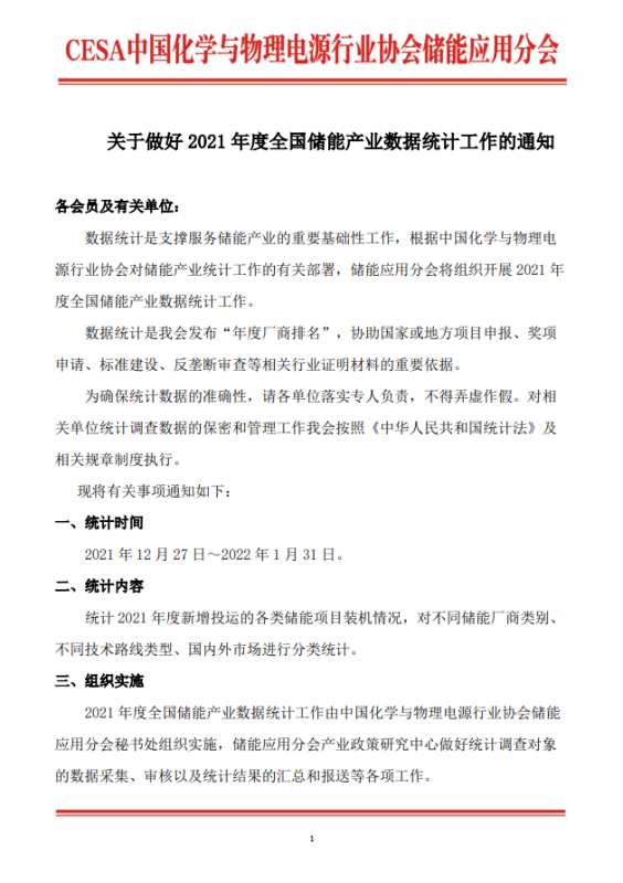 數(shù)據(jù)統(tǒng)計是支撐服務儲能產(chǎn)業(yè)的重要基礎性工作,根據(jù)中國化學與物理電源行業(yè)協(xié)會對儲能產(chǎn)業(yè)統(tǒng)計工作的有關部署,儲能應用分會將組織開展2021年度全國儲能產(chǎn)業(yè)數(shù)據(jù)統(tǒng)計工作。