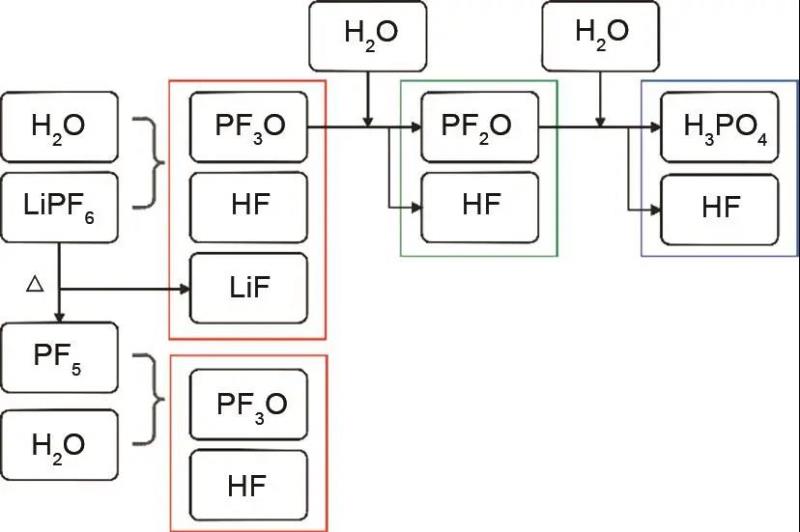 對于安全劑種類而言,雖然常用的七氟丙烷氣體被廣泛用于電池配電室的消防工作,但直接將其注入電池內(nèi)部的效果尚未驗(yàn)證;若考慮將冷卻水持續(xù)注入電池內(nèi)部,雖然溫度較低的水可以帶走大量熱量,但水會與LiPF6發(fā)生一系列反應(yīng)(圖10),同時水的注入會與電池富鋰的負(fù)極反應(yīng)放出大量的熱,還有可能導(dǎo)致電池內(nèi)部電芯間互相短路,導(dǎo)致降溫效果并不明顯。此外,安全劑注入系統(tǒng)中注入時間的設(shè)置仍停留在仿真層面,有待進(jìn)一步測試應(yīng)用。若能了解安全劑與電池內(nèi)部物質(zhì)的反應(yīng)機(jī)理,同時證明其能將正負(fù)電芯短路產(chǎn)生的歐姆熱降到最低,安全劑注入不失為一種防止熱失控發(fā)生的本質(zhì)安全方法。另外,安全劑注入并不局限于電芯層面,對于電池模組以及集裝箱而言,亦可采取安全劑注入的方式以遏止事故擴(kuò)大。于模組層面,安全劑注入指將安全劑注入模組內(nèi),而非直接注入模組內(nèi)電芯,與廣泛運(yùn)用于模組內(nèi)的水冷散熱方法類似;于集裝箱層面,其原理類似于第四代核電站內(nèi)的堆芯安全保護(hù)措施,發(fā)生核事故時,大量安全劑漫灌事故部位,以遏止事故進(jìn)一步擴(kuò)大。
