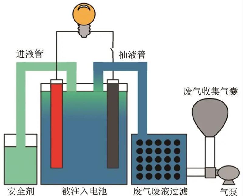 如何在使用有機(jī)電解液的同時也保證電池的本質(zhì)安全應(yīng)用?陳永翀等提出了一種電池安全劑注入的安全維護(hù)方法。安全劑注入是指電芯發(fā)生異常后抽出內(nèi)部電解液及氣體的同時向內(nèi)部注入安全劑的過程。如圖9所示,安全劑注入是遏止電芯熱失控的創(chuàng)新方法之一。這種方法具有以下優(yōu)勢:①溫度較低的安全劑持續(xù)注入異常高溫電池內(nèi)部,與電解液之間的對流散熱促使電池溫度迅速降低;②抽出電池的電解液與內(nèi)部氣體可使得電池反應(yīng)速率迅速減緩;③安全劑會對電池內(nèi)部的化學(xué)反應(yīng)起到抑制作用。例如,鋅鎳液流電池通過不斷循環(huán)更換電解液來保證電池容量的極慢衰減,將正在運(yùn)行的電池中的電解液全部抽出后,電池反應(yīng)也隨之停止。類似的是,Hofmann等使用泵抽出高于正常內(nèi)部溫度5 ℃的軟包鋰離子電池內(nèi)的氣體,隨著電池內(nèi)部壓力的下降,電池內(nèi)部溫度也隨之下降,阻止了熱失控發(fā)生。