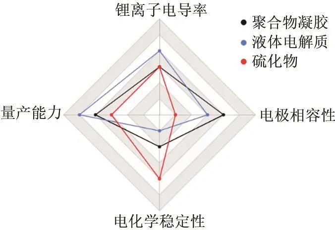 但這并不意味著固態(tài)鋰離子電池在本質(zhì)安全性上趨于完美,由于PEO類固態(tài)聚合物的離子電導(dǎo)率較差,近年來很多學(xué)者投入高電導(dǎo)率的石榴石型或硫化物型無機(jī)電解質(zhì)的研究中,但鋰枝晶可能會沿著晶界進(jìn)入石榴石型多晶固體導(dǎo)致電芯內(nèi)部短路,硫化物型電解質(zhì)在空氣中受潮會形成有毒的硫化氫或二氧化硫,同時在相對高的電壓下工作會快速分解產(chǎn)生易燃?xì)怏w。如圖8所示,雖然固態(tài)電解質(zhì)在提高鋰離子電池的本質(zhì)安全和簡化封裝結(jié)構(gòu)方面具有很大的優(yōu)勢,但其本身的低電導(dǎo)率等問題不容忽視。因此,綜合利用有機(jī)聚合物和無機(jī)材料的優(yōu)點(diǎn),制備與傳統(tǒng)電解液離子電導(dǎo)率相當(dāng)?shù)墓虘B(tài)聚合物-無機(jī)復(fù)合電解質(zhì)是目前固態(tài)鋰離子電池的研究目標(biāo)。另外,用鋰金屬電極代替?zhèn)鹘y(tǒng)的石墨負(fù)極所形成的固態(tài)電池是固態(tài)鋰金屬電池,雖然此類電池引入了較高穩(wěn)定性和阻燃性的固態(tài)電解質(zhì),但選用了金屬鋰作為電極材料,其經(jīng)受高溫時易粉化為鋰顆粒物,使得燃燒風(fēng)險(xiǎn)增加,故此類電芯是否符合電芯本質(zhì)安全概念仍有待商榷。