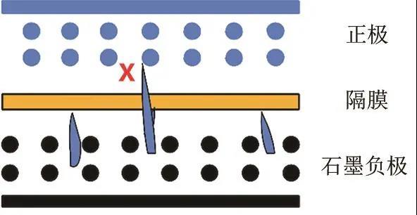 鋰離子電池在經(jīng)歷不同濫用條件后往往會在負(fù)極上產(chǎn)生尖銳的鋰枝晶并刺穿隔膜(圖7),導(dǎo)致電芯內(nèi)部短路,短時間內(nèi)產(chǎn)生大量熱,引起電池冒煙、燃燒甚至爆炸。