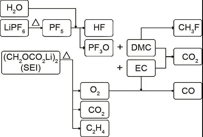 圖6 鋰離子電池常用電解液的受熱分解反應(yīng)