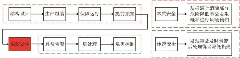 經(jīng)過上述歸納,本質(zhì)安全的內(nèi)涵引申為兩個方面:①本質(zhì)安全并不代表絕對安全,其理念的核心是將危險(xiǎn)發(fā)生的概率降低至足夠小甚至為零,而傳統(tǒng)安全管理方法的重點(diǎn)是控制危險(xiǎn)發(fā)生時造成的危害;②本質(zhì)安全方法不能將系統(tǒng)中所有的危險(xiǎn)徹底消除,最終安全方案是采用本質(zhì)安全方法與傳統(tǒng)安全法結(jié)合的綜合方法來降低生產(chǎn)過程中的危害風(fēng)險(xiǎn)。如圖1所示,本質(zhì)安全涉及了產(chǎn)品結(jié)構(gòu)設(shè)計(jì)、生產(chǎn)組裝、運(yùn)行保障以及風(fēng)險(xiǎn)提前預(yù)知4個安全管理步驟,它們可以和代表傳統(tǒng)安全的異常告警、后處理以及危害控制3個步驟共同減少危害。