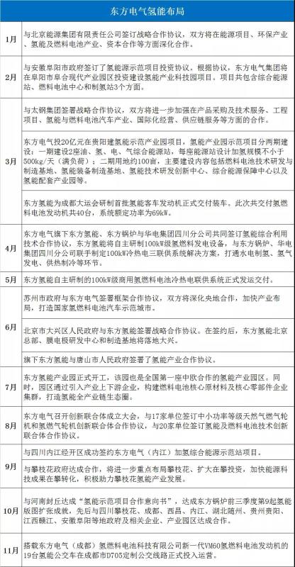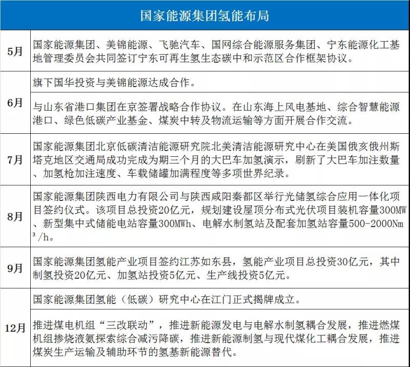 今年以來,以中國石化、中國石油、國家電投、國家能源集團(tuán)、東方電氣、中國能建、中國船舶、華能集團(tuán)、華電集團(tuán)、東風(fēng)汽車、中車集團(tuán)、一汽集團(tuán)為代表的央企氫能布局表現(xiàn)突出,典型事件如下: