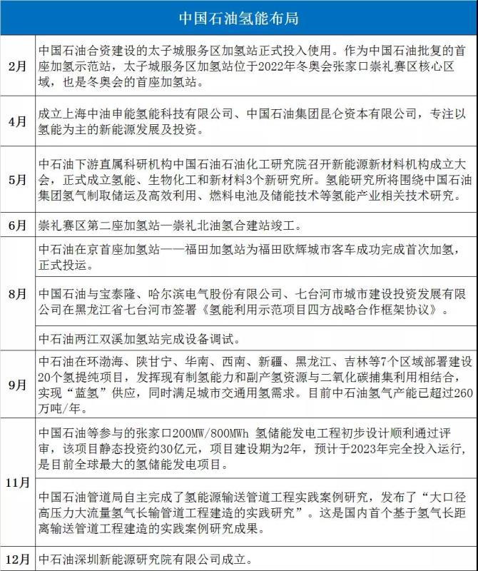 相比于中國石化,中國石油在氫能方面布局的動作相對小些,但相比于去年同期,今年中國石油涉足的深度和廣度都有所增加(如下圖)。未來,中國石油還將在全國范圍投運50座加氫站。
