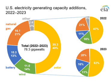 美國能源信息署(EIA)預(yù)計,美國未來兩年所有能源的裝機容量將增加78GW。其中大部分將是大型太陽能發(fā)電設(shè)施和儲能項目,預(yù)計將增長62%,總裝機容量為49GW。這個數(shù)字并不包括小型分布式住宅太陽能發(fā)電項目增加的裝機容量。