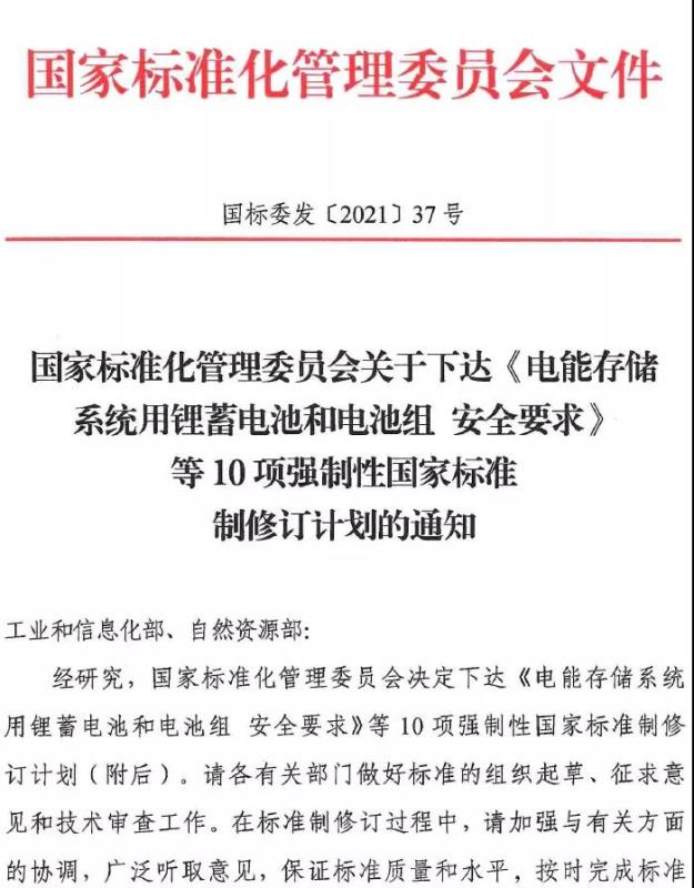中國儲能網(wǎng)訊:日前,《國家標(biāo)準(zhǔn)化管理委員會關(guān)于下達(dá)〈電能存儲系統(tǒng)用鋰蓄電池和電池組 安全要求〉等 10 項(xiàng)強(qiáng)制性國家標(biāo)準(zhǔn)制修訂計(jì)劃的通知》正式發(fā)布。具體內(nèi)容如下: