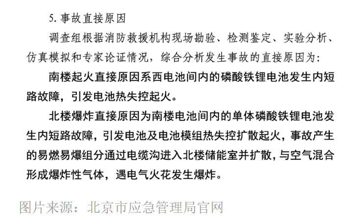 根據(jù)北京市應(yīng)急管理局11月22日發(fā)布的事故調(diào)查報告,認定起火的直接原因是電池間內(nèi)的磷酸鐵鋰電池發(fā)生內(nèi)短路故障,引發(fā)電池熱失控起火,接著又引發(fā)了相鄰北樓電池的起火爆炸。