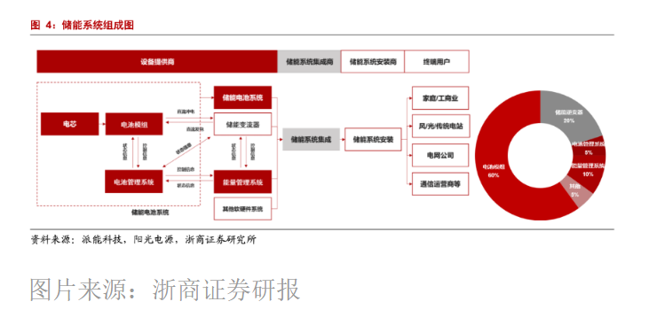 根據(jù)浙商證券研報整合的數(shù)據(jù),電化學儲能系統(tǒng)中,電池模組與逆變器的價值占比最大,分別占60%與20%左右;能量管理系統(tǒng)與電池管理系統(tǒng)占10%與5%。