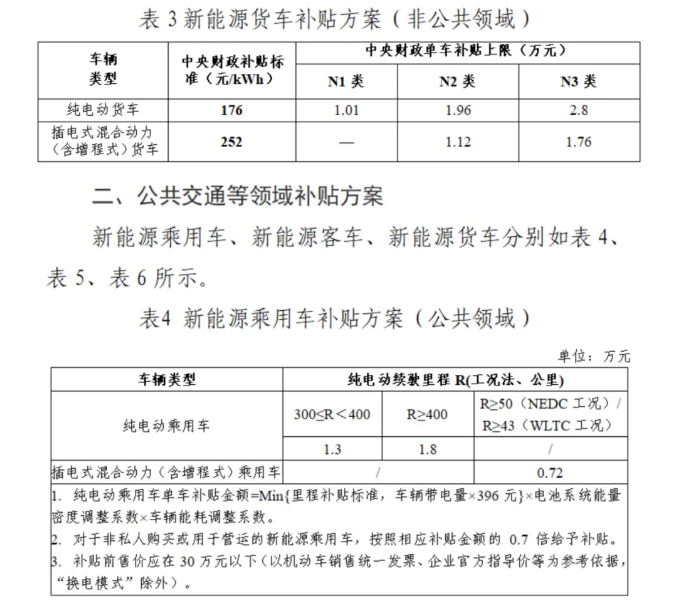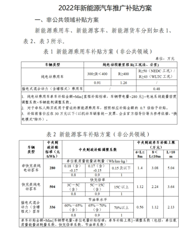 按照財(cái)建〔2020〕86號(hào)文件規(guī)定,2022年新能源汽車購置補(bǔ)貼標(biāo)準(zhǔn)在2021年基礎(chǔ)上退坡30%;城市公交、道路客運(yùn)、出租(含網(wǎng)約車)、環(huán)衛(wèi)、城市物流配送、郵政快遞、民航機(jī)場(chǎng)以及黨政機(jī)關(guān)公務(wù)領(lǐng)域符合要求的新能源汽車,2022年補(bǔ)貼標(biāo)準(zhǔn)在2021年基礎(chǔ)上退坡20%。按此,《通知》明確了不同類型、不同領(lǐng)域車輛產(chǎn)品的補(bǔ)貼標(biāo)準(zhǔn),且自2022年1月1日起執(zhí)行。