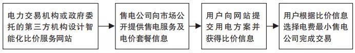 售電公司必須通過電力交易機構(gòu)平臺向市場公開提供自己的產(chǎn)品(服務(wù))及電價套餐,并明確信息有效期限。用戶在電力交易機構(gòu)平臺上提出比價服務(wù)委托要求,提供自己的年度用電方案,可提出擬比較的售電公司;電力交易機構(gòu)或受委托的第三方機構(gòu)通過比價網(wǎng)為用戶提供相應(yīng)用電方案下不同售電公司的年電費結(jié)果等比價信息,供用戶選擇售電公司時決策參考。