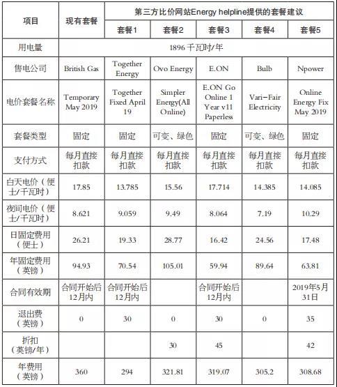 目前國外成熟電力零售市場幾乎都按這種交易機制組織,售電公司提供幾百種售電產(chǎn)品(服務(wù))及電價套餐供用戶選擇,不僅公開透明,而且交易效率高,既體現(xiàn)現(xiàn)代經(jīng)濟思想,也符合傳統(tǒng)市場精神。例如,英國用戶可以在售電公司網(wǎng)站獲取相關(guān)的電費套餐信息,而且售電公司網(wǎng)站免費提供與其他售電公司的電價比較業(yè)務(wù)。為防止售電公司網(wǎng)站提供的比價信息不客觀,在政府監(jiān)管機構(gòu)的干預(yù)下,產(chǎn)生了第三方比價網(wǎng)站,如The Energy Shop,Runpath,Energy Helpline,uSwitch等,提供的服務(wù)包括每種價格套餐的詳細信息和用戶最適合的電價套餐建議。如,用戶在英國第三方比價網(wǎng)站Energy helpline進行電價套餐比選,首先輸入用戶郵編,接著輸入用戶用電信息,假設(shè)用戶目前使用的是British Gas公司的Temporary May 2019套餐,且采用Economy 7計量方式,電費支付方式為每月直接扣款,每月電費為30英鎊。用戶信息輸入完畢后,Energy helpline會給出幾十種電價套餐建議,并選取其中5種電價套餐與用戶目前使用套餐進行比較。表1可以清楚地說明英國電力零售市場用戶比價選擇的過程。