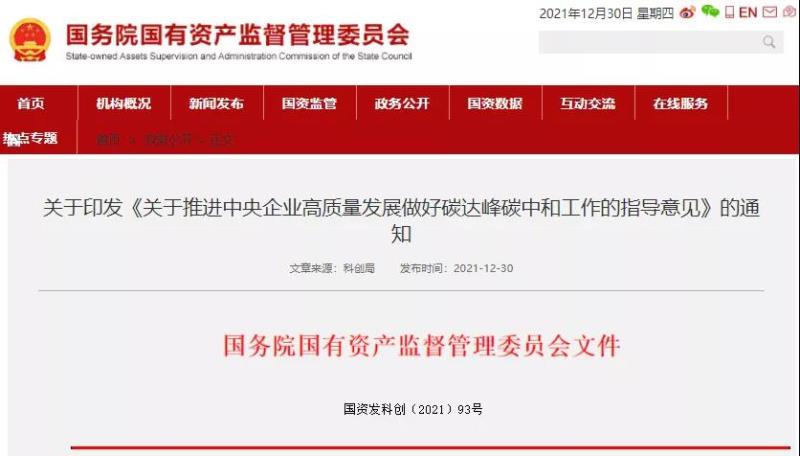 關(guān)于印發(fā)《關(guān)于推進(jìn)中央企業(yè)高質(zhì)量發(fā)展做好碳達(dá)峰碳中和工作的指導(dǎo)意見》的通知