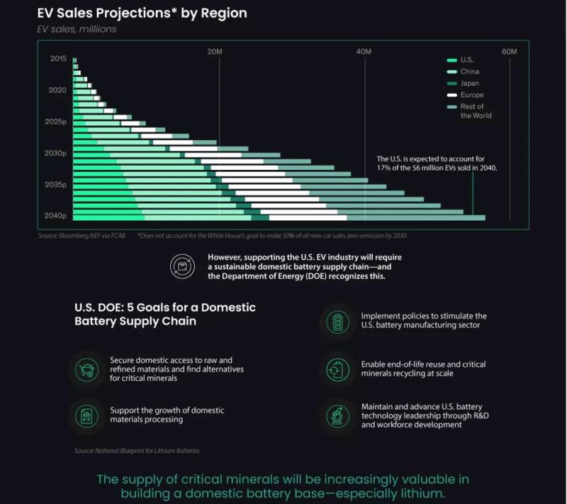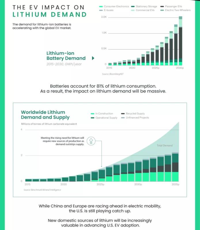 然而,更多的電動(dòng)汽車需要更多的電池,更多的電池需要更多的原材料,尤其是鋰。2020年,電池生產(chǎn)占鋰消費(fèi)量的81%,且需求量不斷增加。據(jù)彭博社報(bào)道,到2030年全球每年可能需要2000 GWh的鋰離子電池,而2020年為223 GWh。鑒于鋰是這些電池的關(guān)鍵成分,對(duì)鋰需求的影響將是巨大的。事實(shí)上,預(yù)計(jì)2025年全球鋰需求將超過供應(yīng)。此外,到2030年,全球?qū)⒂?00家電池巨型工廠開工建設(shè),每年可能需要300萬(wàn)噸鋰,約為目前產(chǎn)量的37倍。隨著全球電動(dòng)汽車市場(chǎng)的擴(kuò)大,滿足日益增長(zhǎng)的鋰需求將需要新的生產(chǎn)來(lái)源。美國(guó)尤其如此,美國(guó)正在努力建立國(guó)內(nèi)電池供應(yīng)鏈,但目前只擁有一個(gè)鋰礦生產(chǎn)基地。