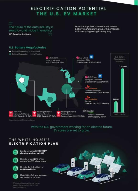 美國(guó)政府也在盡其所能支持電動(dòng)汽車的發(fā)展。最近通過的萬(wàn)億美元基礎(chǔ)設(shè)施法案支持白宮的電氣化計(jì)劃,其中75億美元用于建設(shè)電動(dòng)汽車充電站網(wǎng)絡(luò),另外50億美元用于低排放和零排放公交車。2021年早些時(shí)候,拜登總統(tǒng)簽署了一項(xiàng)行政命令,目標(biāo)是到2030年使50%的新車銷售是電動(dòng)汽車。