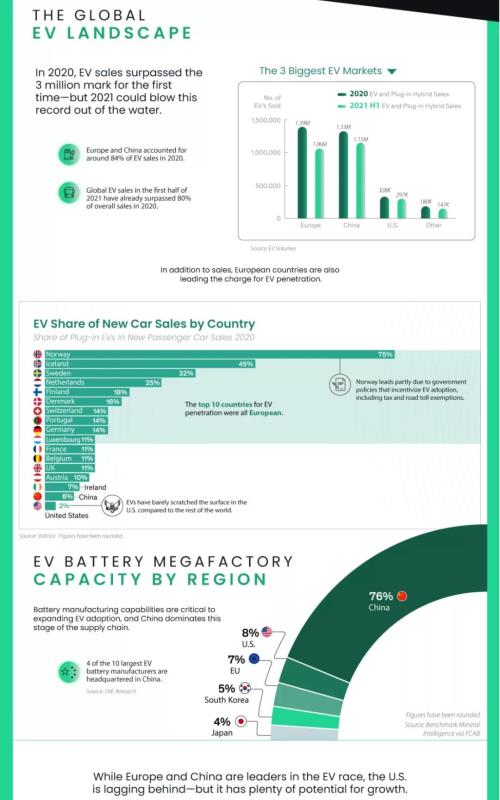 2020年全球電動(dòng)汽車和插電式混合動(dòng)力汽車銷量首次突破300萬(wàn),而2021年上半年的數(shù)據(jù)表明,2021年可能會(huì)再創(chuàng)歷史新高。歐洲和中國(guó)在這兩年一直是領(lǐng)先的電動(dòng)汽車市場(chǎng),插電式混合動(dòng)力和電池電動(dòng)汽車(BEV)80%以上的銷售都在這兩個(gè)地區(qū)。盡管國(guó)家人口是絕對(duì)銷售潛力的驅(qū)動(dòng)因素,但政府激勵(lì)措施在擴(kuò)大電動(dòng)汽車采用方面起到了關(guān)鍵作用。例如,一些歐洲國(guó)家為購(gòu)買和擁有電動(dòng)汽車提供稅收優(yōu)惠,此外還有道路通行費(fèi)豁免等激勵(lì)措施,歐洲國(guó)家也在電動(dòng)汽車普及率排行榜上占據(jù)主導(dǎo)地位。2020年電動(dòng)汽車普及率最高的10個(gè)國(guó)家都是歐洲國(guó)家,挪威位居榜首。