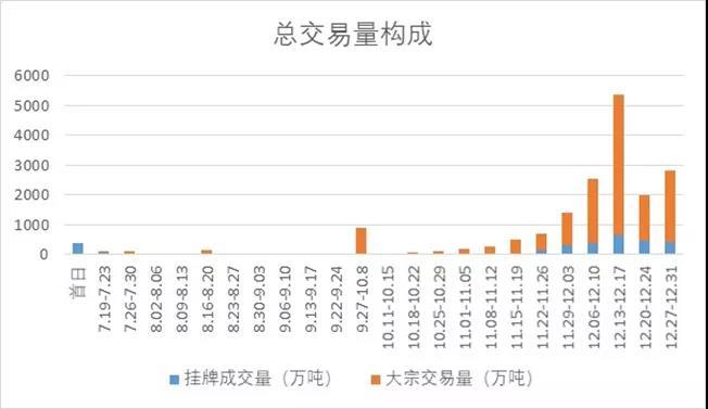一是價(jià)格(掛牌價(jià))較為穩(wěn)定,整體呈不規(guī)則“浴盆”曲線。如圖1,全國(guó)碳市場(chǎng)價(jià)格整體在40-60元之間,開市首周實(shí)現(xiàn)了價(jià)格的較快上漲,短暫突破60元,其后1個(gè)月內(nèi)價(jià)格呈下降趨勢(shì),隨后價(jià)格長(zhǎng)期維持在43元上下橫盤。橫盤期也是成交量急劇縮量期(如圖2)。進(jìn)入12月份,隨著履約截止日迫近,成交量快速放量,價(jià)格持續(xù)上升。半年周期來(lái)看,價(jià)格周K圖呈不規(guī)則“浴盆”曲線,平均掛牌價(jià)格為47.16元/噸。