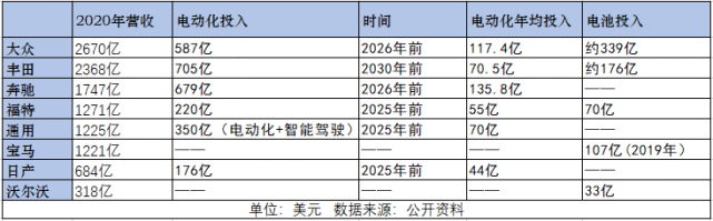 下表是豐田大眾等車企近5-10年關(guān)于電動(dòng)化的投入計(jì)劃,僅以下8家營(yíng)收過千億的車企就將投入超2700億美元。其中,大眾、豐田、通用更是明確將在電池方面投入上百億美元。從投資方式上,收入千億以上的車企,都選擇“兩條腿”走路,既與電池廠合作研發(fā),也加強(qiáng)內(nèi)部研究。而相對(duì)沒有那么闊綽的車企,則選擇與電池廠合作開發(fā)建廠。