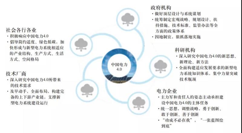 要實(shí)現(xiàn)中國電力4.0,需要政府、科研機(jī)構(gòu)、電力企業(yè)、技術(shù)廠商以及社會各行各業(yè)的共同努力(見圖4),共同攜手銳意進(jìn)取。