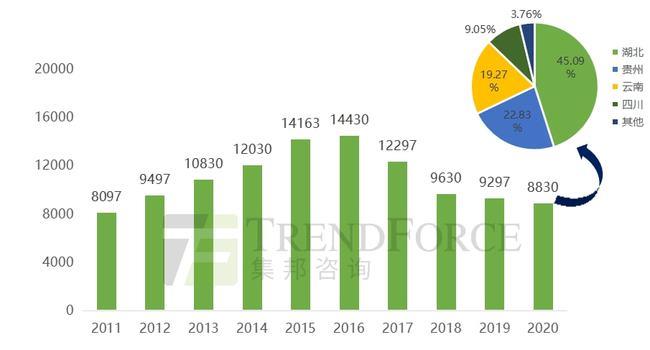 圖7:2011-2020年中國磷礦石產(chǎn)量(單位:萬噸)