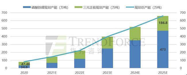 Trendforce集邦咨詢預(yù)計至2025年全球動力鋰電池對正極材料需求將突破215萬噸,若加上儲能、消費電子等領(lǐng)域,正極材料需求或?qū)⒊^360萬噸。而單單是國內(nèi)磷酸鐵鋰的規(guī)劃總產(chǎn)能至2025年便超過了500萬噸,還不包括三元正極,這背后的產(chǎn)能過?!跋葳濉毙枰琛?
