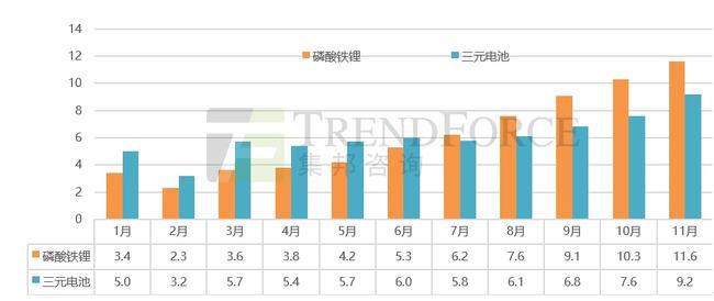 數(shù)據(jù)顯示,2021年1-11月中國市場動力電池裝機(jī)量約為128.3GWh,同比增長153.1%。從月度裝機(jī)量數(shù)據(jù)來看,中國市場磷酸鐵鋰電池的裝機(jī)量從7月份開始便反超了三元電池的裝機(jī)量,此后連續(xù)5個月裝機(jī)量繼續(xù)反超三元電池,預(yù)計全年兩者市場占比將基本持平。