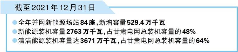 中國(guó)儲(chǔ)能網(wǎng)訊:截至2021年12月31日,甘肅電網(wǎng)全年并網(wǎng)新能源場(chǎng)站84座,新增容量529.4萬千瓦,同比增長(zhǎng)24%,刷新了國(guó)網(wǎng)甘肅省電力公司年度新能源投產(chǎn)歷史紀(jì)錄,其中新增風(fēng)電368.7萬千瓦(45座風(fēng)力發(fā)電廠)、光伏160.7萬千瓦(39座光伏電站)。甘肅電網(wǎng)新能源裝機(jī)容量達(dá)2763萬千瓦,占全網(wǎng)總裝機(jī)容量的48%,清潔能源裝機(jī)容量達(dá)3671萬千瓦,占全網(wǎng)總裝機(jī)容量的64%。