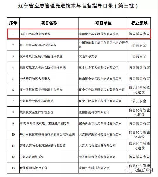 在公示的《遼寧省應(yīng)急管理先進(jìn)技術(shù)與裝備指導(dǎo)目錄(第三批)》中,由沈陽微控新能源技術(shù)有限公司組織申報(bào)的飛輪UPS 應(yīng)急電源系統(tǒng),入選防災(zāi)減災(zāi)救災(zāi)領(lǐng)域目錄。