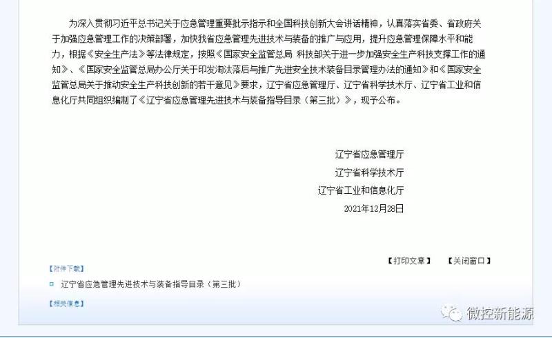 中國(guó)儲(chǔ)能網(wǎng)訊:2021年12月28日,為深入貫徹習(xí)近平總書記關(guān)于應(yīng)急管理重要批示指示和全國(guó)科技創(chuàng)新大會(huì)講話精神,認(rèn)真落實(shí)省委、省政府關(guān)于加強(qiáng)應(yīng)急管理工作的決策部署,加快我省應(yīng)急管理先進(jìn)技術(shù)與裝備的推廣與應(yīng)用,提升應(yīng)急管理保障水平和能力,根據(jù)《安全生產(chǎn)法》等法律規(guī)定,按照《國(guó)家安全監(jiān)管總局科技部關(guān)于進(jìn)一步加強(qiáng)安全生產(chǎn)科技支撐工作的通知》、《國(guó)家安全監(jiān)管總局辦公廳關(guān)于印發(fā)淘汰落后與推廣先進(jìn)安全技術(shù)裝備目錄管理辦法的通知》和《國(guó)家安全監(jiān)管總局關(guān)于推動(dòng)安全生產(chǎn)科技創(chuàng)新的若干意見》要求,遼寧省應(yīng)急管理廳、遼寧省科學(xué)技術(shù)廳、遼寧省工業(yè)和信息化廳共同組織編制了《遼寧省應(yīng)急管理先進(jìn)技術(shù)與裝備指導(dǎo)目錄(第三批)》。
