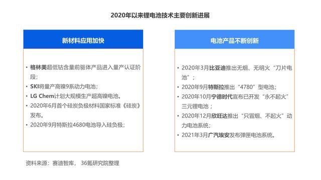 一方面,為提升鋰離子電池能量密度,同時達到控制生產成本目的,國內外知名企業(yè)開始加速低鈷乃至無鈷正極材料、硅基負極材料等新材料在鋰離子電池生產研制過程中的應用。另一方面,2020年以來,隨著寧德時代、比亞迪、LG化學等產業(yè)龍頭企業(yè)持續(xù)推進技術研發(fā)與創(chuàng)新,高鎳低鈷電池、硅負極材料電池、“永不起火”[1]電池、固態(tài)電池等創(chuàng)新產品得到快速發(fā)展。