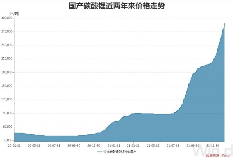 一方面,動力電池的上游原材料鎳、鈷、鋰等金屬價格波動之劇烈超出市場預期,如電池級碳酸鋰均價已從2021年初的5萬元/噸,一路跳漲到近期的29萬元/噸,漲幅達480%,最高報價甚至突破30萬元/噸,而鈷價也已創(chuàng)近3年來的新高。