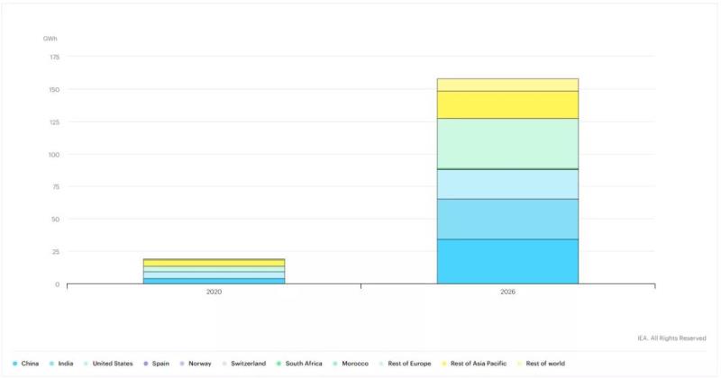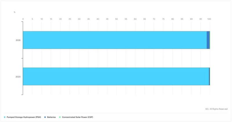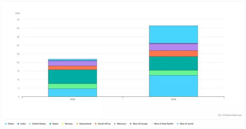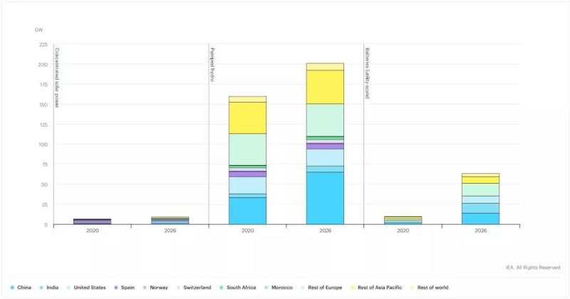 圖:2020年-2026年聚光太陽能、抽水蓄能、電池儲(chǔ)能儲(chǔ)能能力