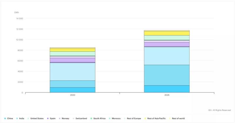 抽水蓄能水電 (PSH) 提供了全球42%的電力存儲(chǔ)容量擴(kuò)展,未來五年內(nèi),PSH 的新增裝機(jī)容量將超過40 吉瓦,仍然是最大的儲(chǔ)能裝機(jī)來源。到2026年累計(jì)裝機(jī)容量將達(dá)到200 吉瓦,是電池的三倍,中國占全球PSH產(chǎn)能增長(zhǎng)的四分之三。