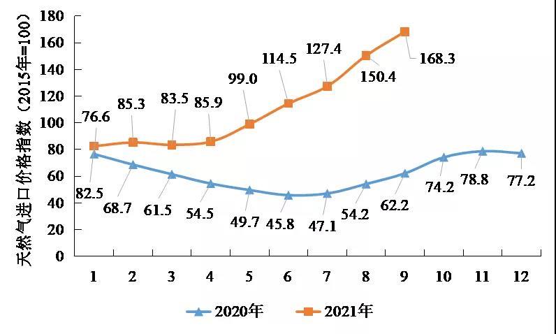 一是傳統(tǒng)能源價(jià)格突破歷史紀(jì)錄。整個(gè)歐洲方面,被視為歐洲天然氣價(jià)格風(fēng)向標(biāo)的荷蘭天然氣期貨價(jià)格TTF于2021年10月5日突破了每千立方米1200美元,創(chuàng)下歷史新高。根據(jù)德國聯(lián)邦統(tǒng)計(jì)局的數(shù)據(jù),2021年,德國天然氣進(jìn)口價(jià)格整體呈上漲趨勢,2020至2021年9月,德國天然氣進(jìn)口價(jià)格指數(shù)(該指數(shù)以2015年價(jià)格為100)持續(xù)快速上升。2021年9月份天然氣進(jìn)口價(jià)格比去年同期上漲171%。