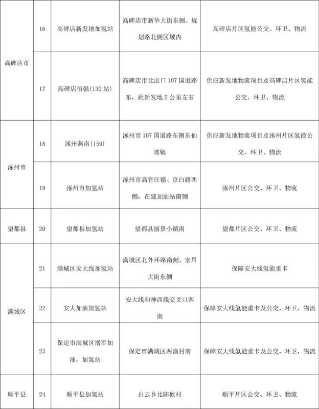 至2025年,規(guī)劃選址25座加氫站(或油氣氫電綜合能源站),其中,徐水區(qū)規(guī)劃5座加氫站,分別是容易線綜合能源站、容易線驛站南區(qū)加氫站、中石化徐水高速口加氫站、河北中油一站加氫站、朝陽北大街(徐水段)加氫站;競秀區(qū)3座,即保定江城路(2站)加氫站、隆興西路加氣站、中海油樂凱大街加氫站;易縣3座,分別是易縣塘湖鎮(zhèn)劉家莊村綜合能源站、易縣經濟開發(fā)區(qū)站、易縣南水北調調蓄庫綜合能源站;蓮池區(qū)2座,即保定市客運中心站、東風東路加氣站;清苑區(qū)2座,分別是清苑綜合能源站、清苑垃圾處理中心加氫站;高碑店市2座,分別是高碑店新發(fā)地加氫站、高碑店伯強(130站)加氫站;涿州市2座,分別是涿州燕南(159)加氫站、涿州市加氫站;望都縣1座,即望都縣加氫站;滿城區(qū)3座,分別是滿城區(qū)安大線加氫站、安大加氫站、保定市滿城區(qū)增軍加油、加氫站;順平縣1座,即順平縣加氫站;定興縣1座,即河北中油第四加油站。到2025年規(guī)劃建成10座以上加氫站。