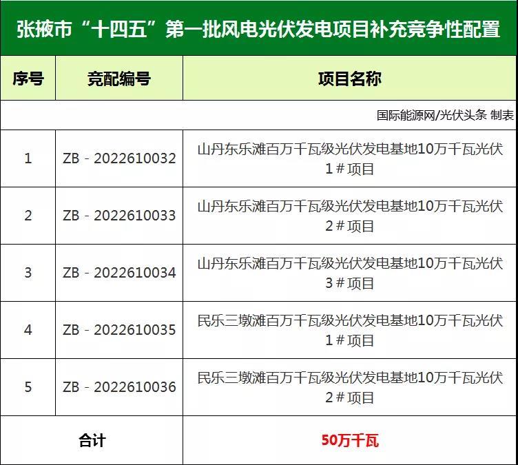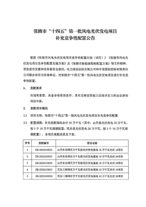 中國儲能網(wǎng)訊:1月10日,甘肅省張掖市人民政府發(fā)布張掖市“十四五”第一批風(fēng)電光伏發(fā)電項目補充競爭性配置公告。根據(jù)公告,配置規(guī)模為:補充競配指標(biāo)合計50萬千瓦(其中:山丹縣光伏發(fā)電30萬千瓦,按3個10萬千瓦規(guī)模配置;民樂縣光伏發(fā)電20萬千瓦,按2個10萬千瓦規(guī)模配置),各項目競配信息見下表。