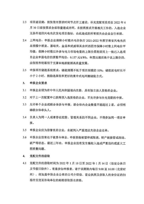 根據(jù)公告,項目建設(shè)期為按張掖市要求時間節(jié)點開工建設(shè),補充競配項目應(yīng)在2022年6月30日前按要求全部容量建成并網(wǎng),未按照要求開展相關(guān)工作的,入選企業(yè)無條件退回風(fēng)電光伏發(fā)電項目指標(biāo),由此造成的所有損失由企業(yè)自行承擔(dān)。