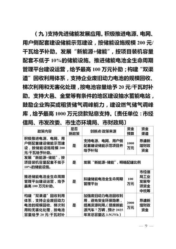 中國儲能網訊:1月6日,成都市經濟和信息化局發(fā)布關于公開征求《成都市能源結構調整十條政策措施》意見建議的通知。建議指出支持先進儲能發(fā)展應用。積極推進電源、電網、用戶側配套建設儲能示范建設,按儲能設施規(guī)模200元/千瓦給予補助。發(fā)展“新能源+儲能”,按項目裝機容量配套不低于10%的儲能設施。推進儲能電池全生命周期管理平臺建設運營,給予最高100萬元補助;構建“雙渠道”回收利用體系,支持企業(yè)廢舊動力電池的規(guī)?;厥?、梯次利用和無害化處理,按電池容量給予20元/千瓦時補助。支持大邑、金堂等有條件的地區(qū)建設抽水蓄能電站,鼓勵企業(yè)購買或租賃儲氣調峰能力,建設燃氣儲氣調峰庫,給予最高1000萬元貸款貼息支持。