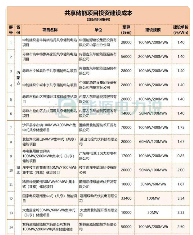 各省備案的共享儲能項目中,單個項目的容量規(guī)模在100MWh-400MWh之間,能源電力說選取了內(nèi)蒙古、湖北、山西3省部分項目來看看共享儲能的建設成本。內(nèi)蒙古6個共享儲能項目建設單價是1.4元/Wh,湖北7個項目單價區(qū)間較大,山西省14個項目單價區(qū)間0.98~2.5元/Wh。