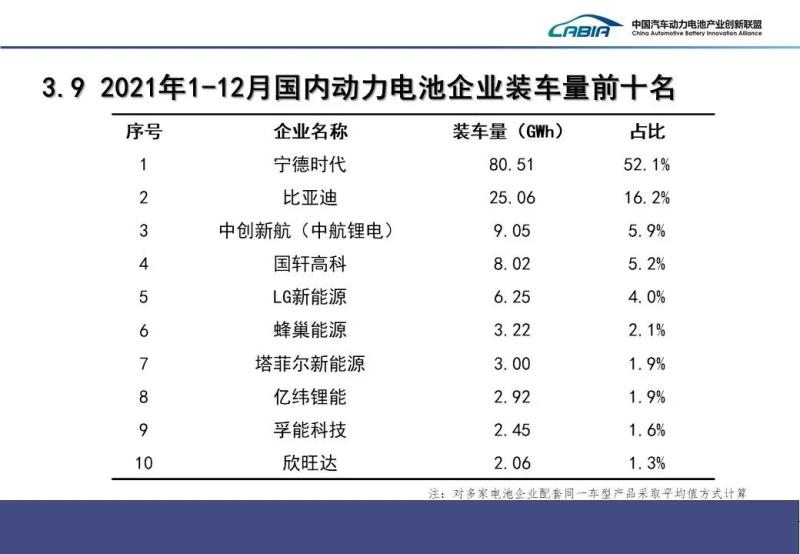 2021年12月國內(nèi)動力電池企業(yè)裝車量TOP10的企業(yè)分別是:寧德時代、比亞迪、中創(chuàng)新航、國軒高科、LG新能源、蜂巢能源、塔菲爾新能源、孚能科技、欣旺達(dá)、億緯鋰能。
