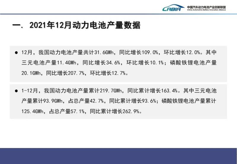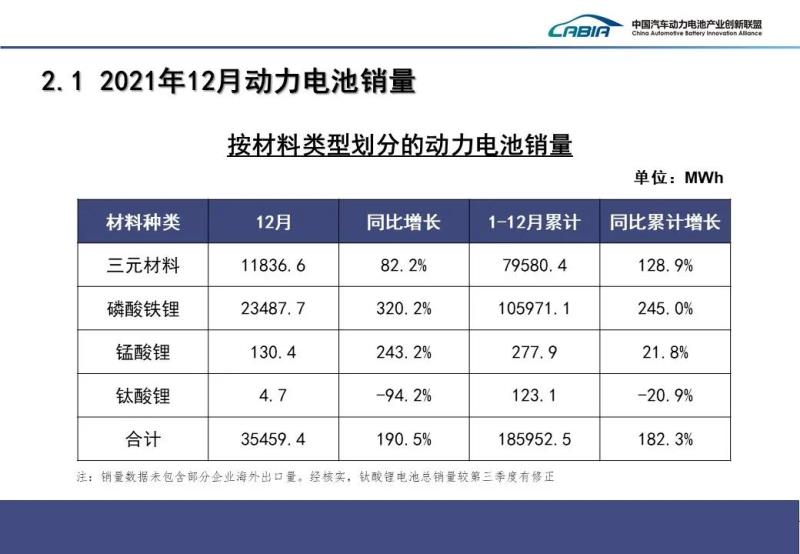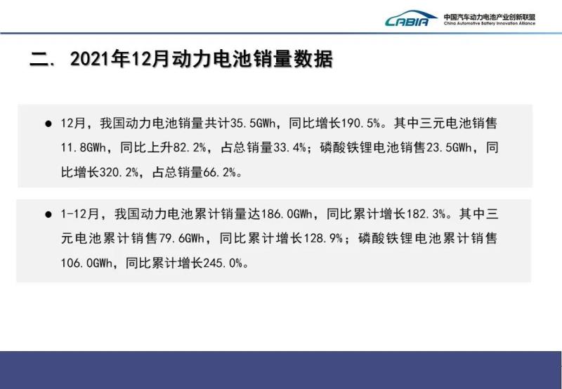 銷量方面,2021年12月,我國動力電池銷量共計35.5GWh,同比增長190.5%。其中三元電池銷售11.8GWh,同比上升82.2%,占總銷量33.4%;磷酸鐵鋰電池銷售23.5GWh,同比增長320.2%,占總銷量66.2%。