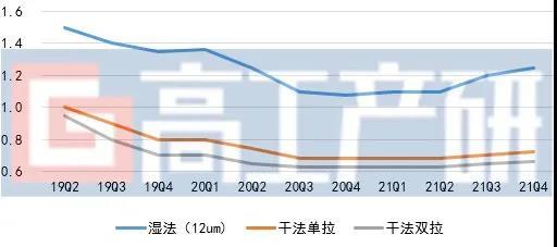 2019-2021Q4鋰電基膜隔膜價格走勢(元/㎡)