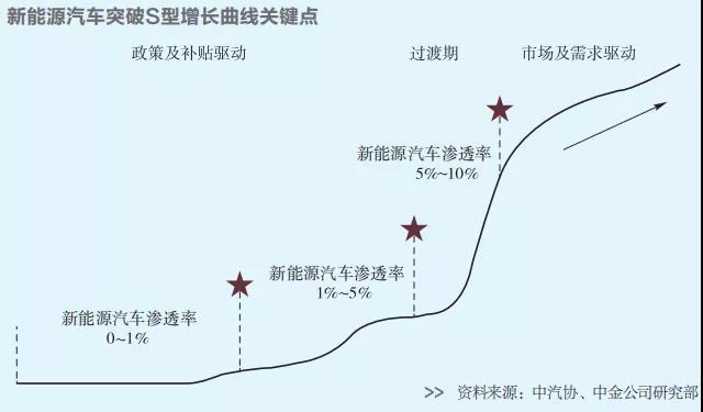 談到增長(zhǎng),往往離不開(kāi)S型曲線。十九世紀(jì)末,法國(guó)社會(huì)學(xué)家塔爾德觀察到,一個(gè)新思想的采納率在時(shí)間中遵循一種S型曲線,即開(kāi)始時(shí)緩慢、中期加快、后期平緩。S型曲線逐漸廣泛應(yīng)用于社會(huì)學(xué)、生物統(tǒng)計(jì)學(xué)、臨床、數(shù)量心理學(xué)、市場(chǎng)營(yíng)銷(xiāo)等多個(gè)領(lǐng)域。汽車(chē)行業(yè)普遍認(rèn)為,全球的汽車(chē)電動(dòng)化已經(jīng)突破臨界點(diǎn),進(jìn)入了S型曲線的陡峭增長(zhǎng)期,將呈現(xiàn)爆發(fā)趨勢(shì),2022年的新車(chē)滲透率將突破20%??紤]到2021年新能源汽車(chē)受到了電池供應(yīng)受限、芯片供應(yīng)短缺以及產(chǎn)能受限等因素影響,而2022年這些因素將逐漸緩解,我國(guó)新能源汽車(chē)銷(xiāo)量預(yù)計(jì)為500萬(wàn)~600萬(wàn)輛。