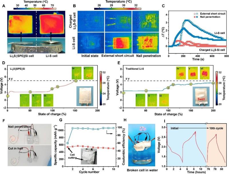 圖2. 基于硫化鋰正極與硅負(fù)極的全固態(tài)軟包電池安全性評(píng)價(jià):(A)過(guò)熱、(B,C)內(nèi)、外部短路、(D,E)過(guò)充、(F,G)空氣中穿刺剪切后充放電、(H,I)剪切浸水后充放電。