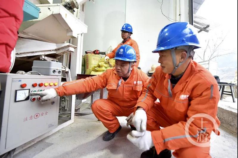 其單柜15千瓦的功率,能持續(xù)放電1小時20分鐘,為小型生產(chǎn)、重要場所提供應(yīng)急電源。圖為國家電網(wǎng)紅巖共產(chǎn)黨員服務(wù)隊隊員,主動上門為村民打米機器進行安全用電服務(wù)。