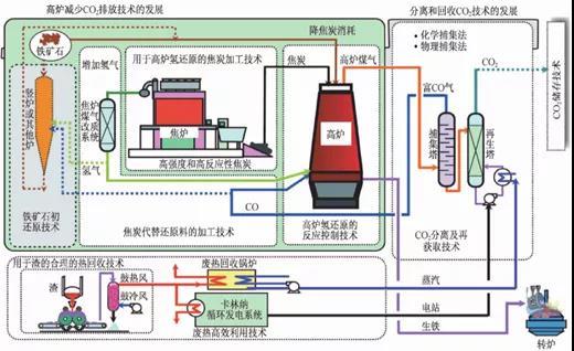 以焦炭為還原劑的高爐煉鐵是煉鋼中主要的碳排放過(guò)程。根據(jù)2020年中國(guó)鋼鐵工業(yè)協(xié)會(huì)統(tǒng)計(jì)的數(shù)據(jù)顯示,其會(huì)員單位的高爐煉鐵入爐焦比為355.19kg/t,煉鐵過(guò)程產(chǎn)生的碳排放量為每噸生鐵1.3噸CO2。在高爐煉鐵中,采用技術(shù)工藝優(yōu)化、焦?fàn)t煤氣噴吹等方式可降低焦炭的使用量,從而達(dá)到減排的作用。例如用噴吹氫代替10%的焦炭,可減少約5%-10%的碳排放量。