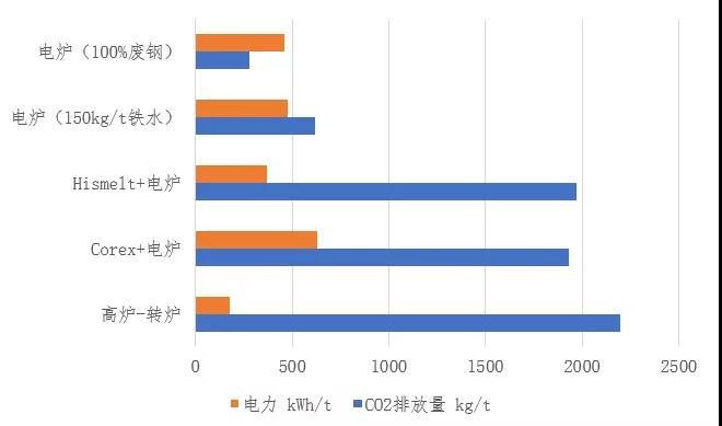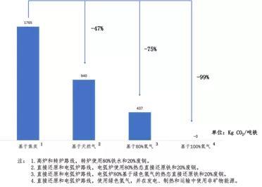 我國(guó)現(xiàn)有高爐和轉(zhuǎn)爐路線碳排放量為1.765噸CO2/噸鐵。對(duì)于高品位的鐵礦石,可采用直接還原和電弧爐路線。采用以80%的天然氣直接還原鐵和20%的廢鋼生產(chǎn)工藝,天然氣先經(jīng)過(guò)裂解或重整,產(chǎn)生C、CO、H2。由于天然氣本身含氫元素,參與還原反應(yīng)的碳比高爐少,碳排放量明顯降低。據(jù)測(cè)算,比現(xiàn)有的高爐轉(zhuǎn)爐路線,可降低碳排放量47%。采用以80%的綠色氫氣直接還原鐵和20%的廢鋼生產(chǎn)工藝,可降低75%碳排放。當(dāng)全部采用100%綠色氫氣直接還原鐵和電弧爐路線時(shí),幾乎沒(méi)有碳排放。