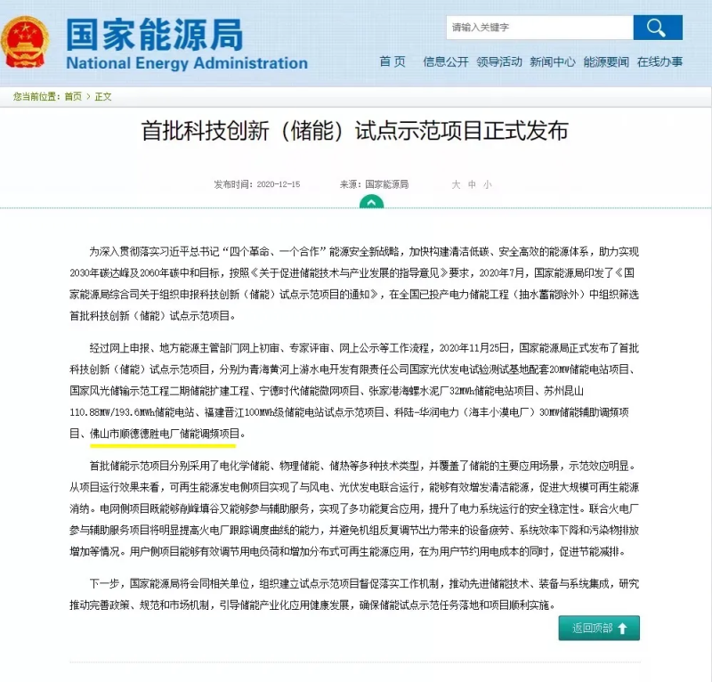 1、2020年12月,智光佛山市順德德勝電廠儲能調(diào)頻項目入選“國家能源局首批科技創(chuàng)新(儲能)試點示范項目”,智光級聯(lián)型高壓儲能技術(shù)被市場認(rèn)可,多個項目陸續(xù)投運。