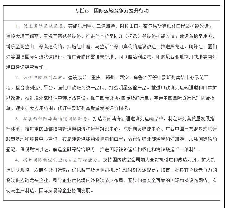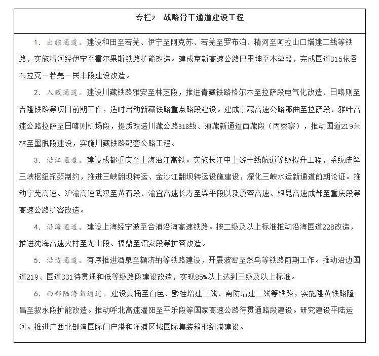 加強戰(zhàn)略骨干通道建設(shè)。推進出疆入藏通道建設(shè),擴大甘新、青新、青藏、川藏四條內(nèi)聯(lián)主通道通行能力,穩(wěn)步推進川藏鐵路建設(shè),加快推進新藏鐵路和田至日喀則段前期工作、適時啟動重點路段建設(shè),有序推進滇藏鐵路前期工作,密實優(yōu)化航空航線網(wǎng)絡(luò)布局,構(gòu)建多向聯(lián)通的通道布局。暢通沿江通道,加快建設(shè)沿江高鐵,優(yōu)化以高等級航道和干線鐵路、高速公路為骨干的沿江綜合運輸大通道功能。升級沿海通道,提高鐵路通道能力,推進高速公路繁忙路段擴容改造,提升港口航道整體效能,構(gòu)建大容量、高品質(zhì)的運輸走廊。貫通沿邊通道,提級改造普通國省干線,推進重點方向沿邊鐵路建設(shè),提高安全保障水平。建設(shè)西部陸海新通道,發(fā)揮鐵路在陸路運輸中的骨干作用和港口在海上運輸中的門戶作用,強化東、中、西三條通路,形成大能力主通道,銜接國際運輸通道。