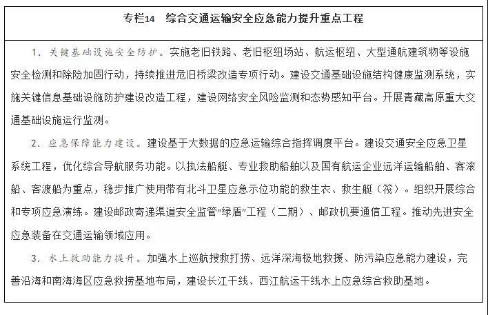 健全綜合交通運輸應(yīng)急管理體制機制,完善應(yīng)急協(xié)調(diào)機制和應(yīng)急預(yù)案體系,加強交通運輸調(diào)度與應(yīng)急指揮平臺建設(shè)。推進區(qū)域性公路應(yīng)急裝備物資儲備中心建設(shè)。加強水上交通安全監(jiān)管、航海保障和救助打撈能力建設(shè),完善沿海和內(nèi)河溢油應(yīng)急設(shè)備庫,構(gòu)建陸海空天一體化水上交通運輸安全保障體系。建設(shè)城市軌道交通應(yīng)急演練中心。以骨干航空物流企業(yè)為主體構(gòu)建航空應(yīng)急服務(wù)網(wǎng)絡(luò)。建設(shè)海事監(jiān)管指揮系統(tǒng)。在開展城市交通基礎(chǔ)設(shè)施地下空間、低洼區(qū)域、重點區(qū)段、重要點位、關(guān)鍵設(shè)施等隱患排查基礎(chǔ)上,建立健全風(fēng)險臺賬和災(zāi)害隱患清單,補齊設(shè)施設(shè)備、應(yīng)急搶險物資等短板,持續(xù)完善應(yīng)急處置預(yù)案,健全應(yīng)急響應(yīng)機制,提升應(yīng)對極端天氣能力。加強應(yīng)急專業(yè)隊伍和志愿者隊伍建設(shè),充實國家應(yīng)急運輸儲備力量。健全應(yīng)對重大疫情、防范應(yīng)對恐怖襲擊、保障信息安全等非傳統(tǒng)安全應(yīng)急指揮體系和應(yīng)急交通組織。
